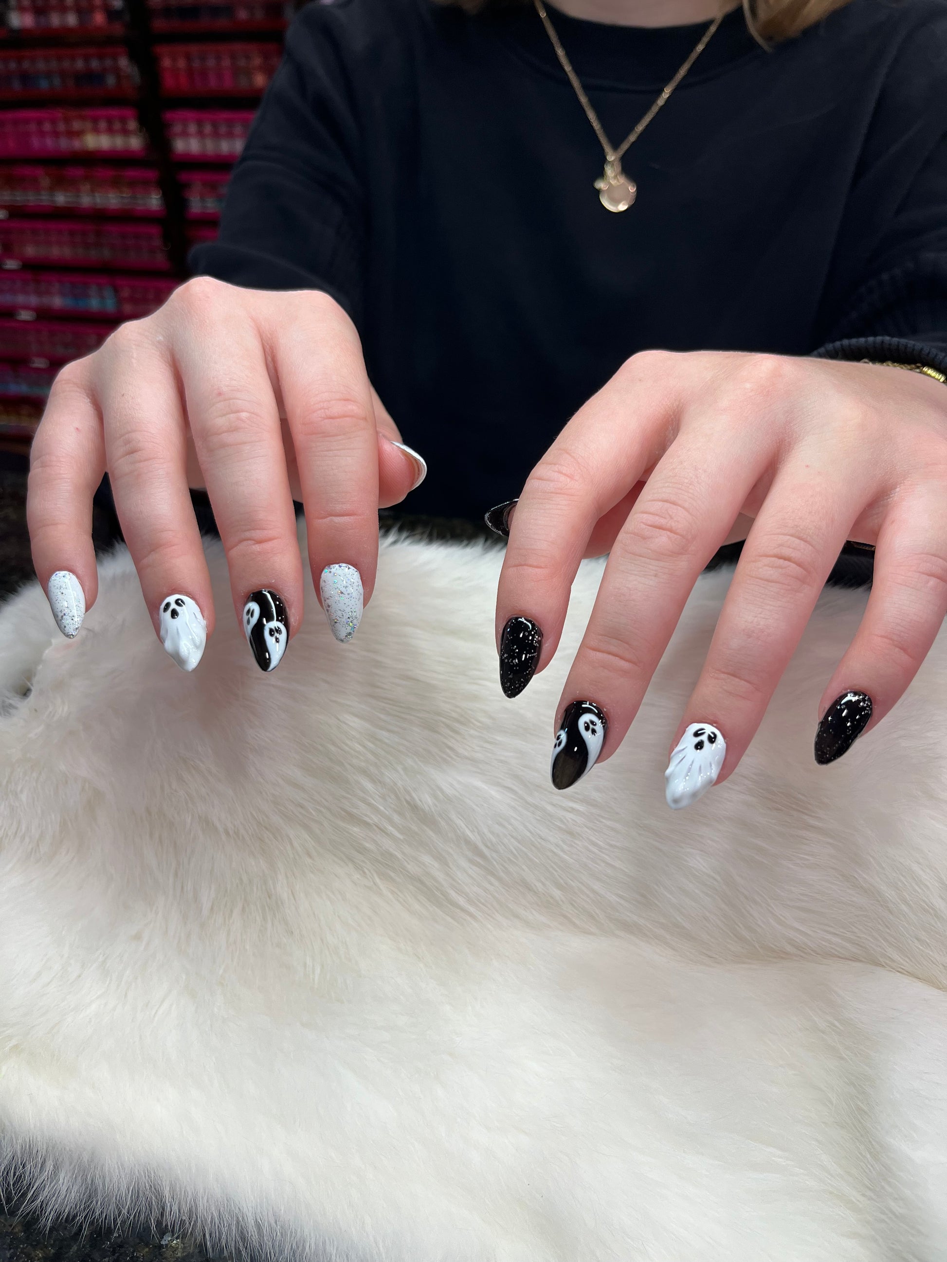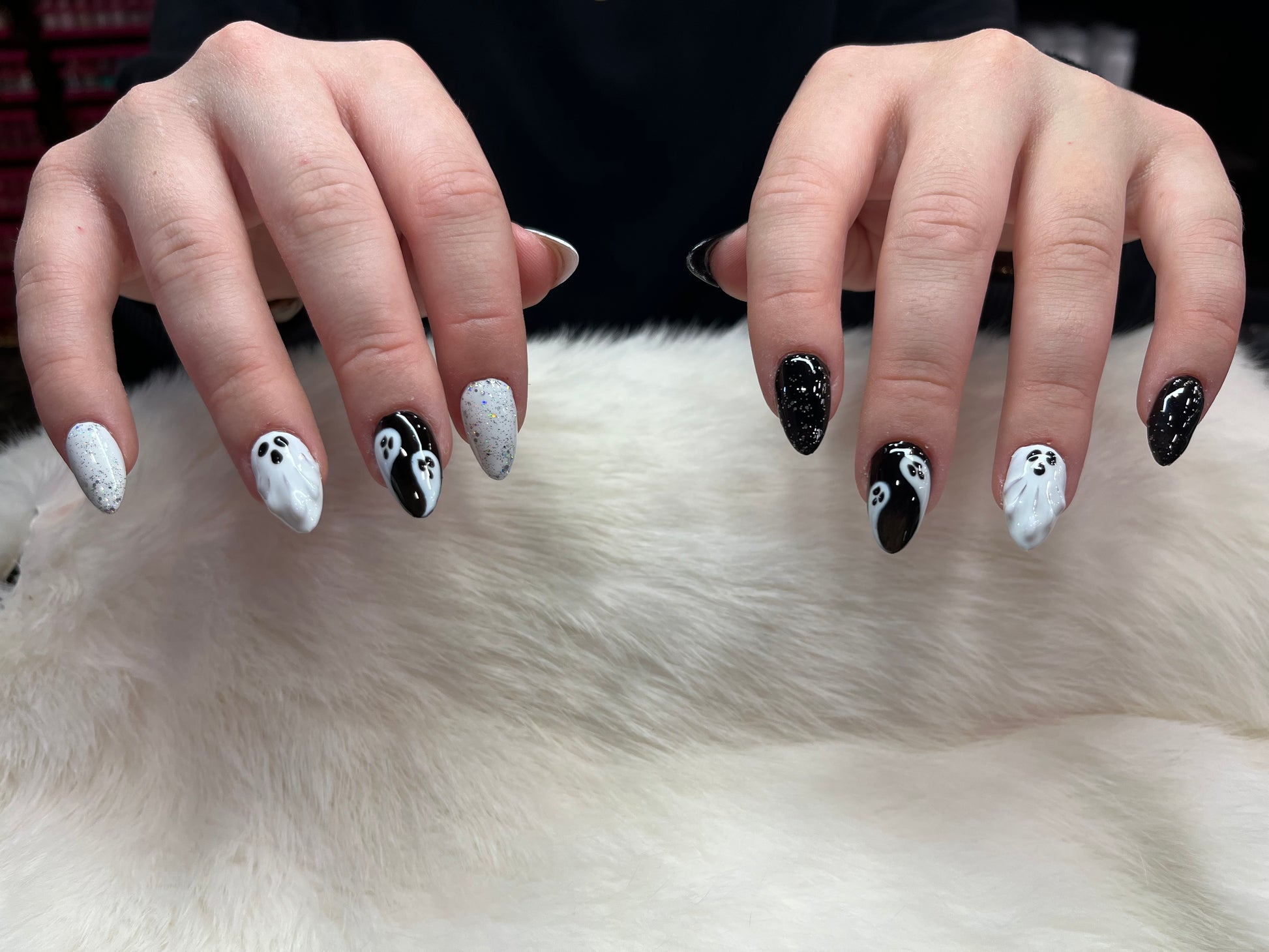 - Elements: 3D ghost accent nail, hand-painted ghosts, alternate black and white glitters